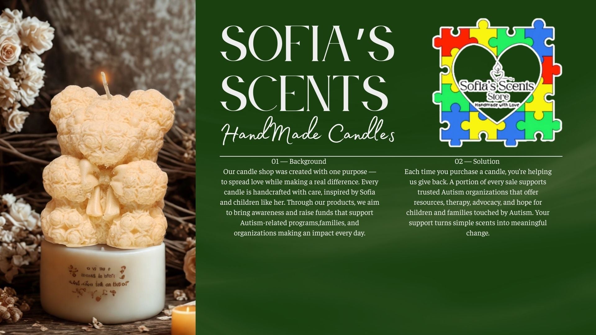 With a single flame, Sofia’s Scents candles spark warmth, hope, and connection. Each scent is a gesture of love — a moment to remember — and every purchase helps brighten the lives of children with Autism.